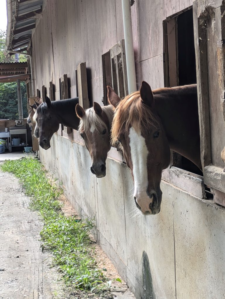 いつもいつも着いた時と帰る時 馬房から馬全頭が一斉同時に顔を出して お迎え お見送り! 何だかホッコリ感満喫です そしてそれと共に 1人1頭1馬場で馬を操るはお勉強の時間でもあるのです、